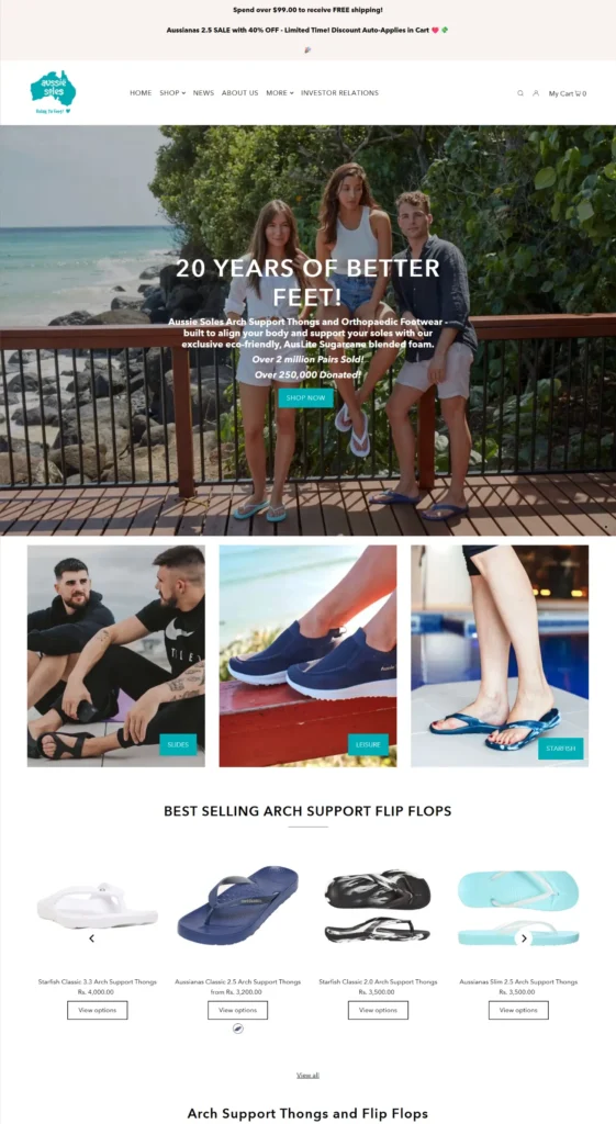 UX-Driven Layout Design: Designed intuitive navigation, product category structure (e.g., “Thongs”, “Slides”), and integrated visual storytelling to showcase product benefits (arch support, sustainability).