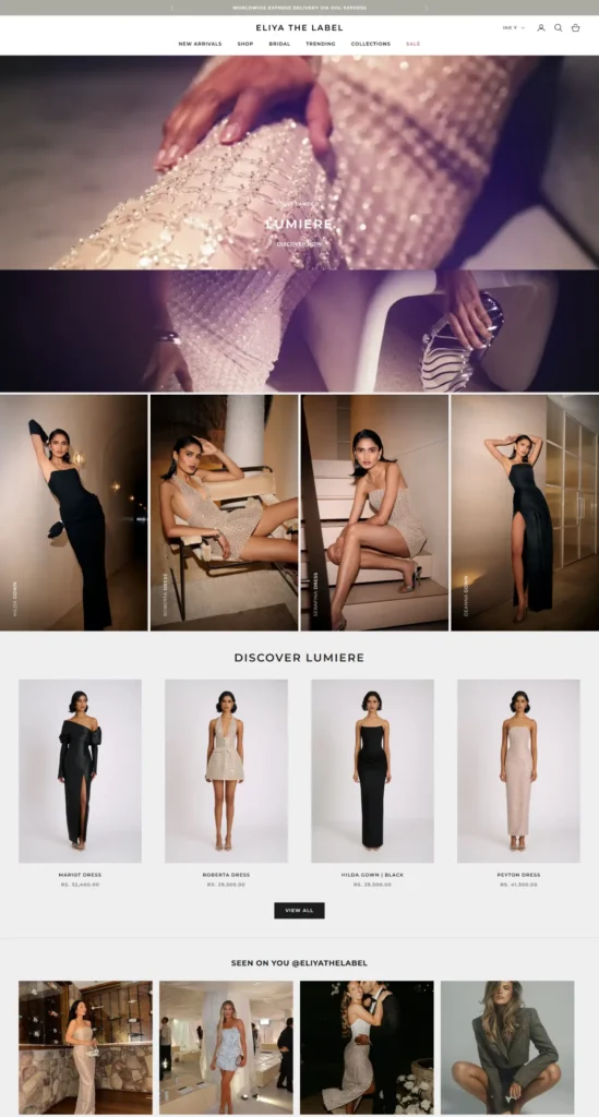 Tailored Shopify themes to reflect Eliya’s luxury aesthetic—dramatic visual typography, elegant product grids, and full-screen imagery to elevate product storytelling.